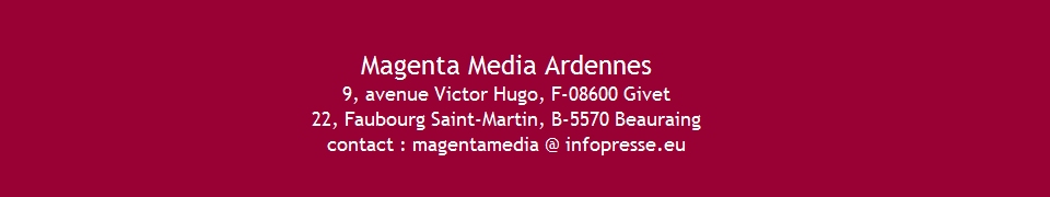 Magenta Media .fr/.be est une agence de presse locale et d'édition transfrontalière dont l'objectif est d'étendre la visibilité, la diffusion et le référencement des actualités et informations commerciales en Ardennes, autour de la Pointe de Givet. |